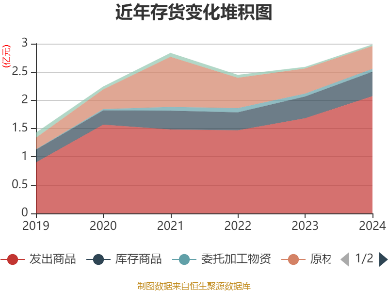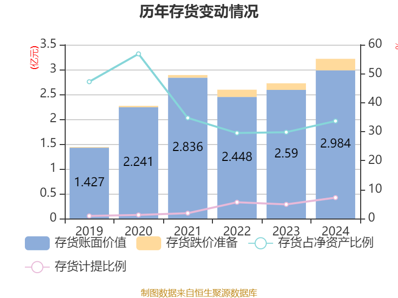 从存货变动来看,截至2024年末,公司存货账面价值为2.98亿元,占净资产的33.65%,较上年末增加3941.37万元。其中,存货跌价准备为2318.81万元,计提比例为7.21%。