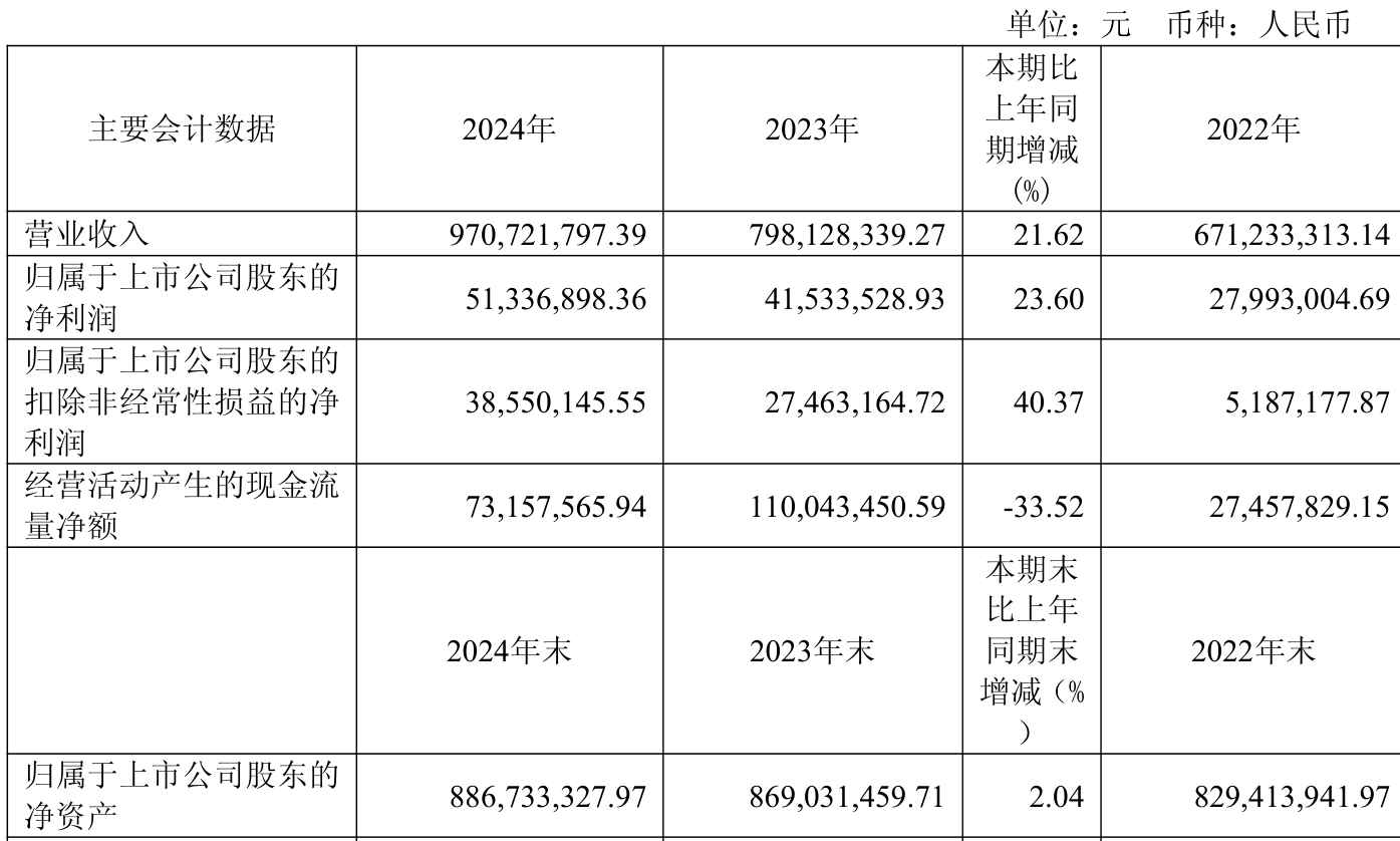 中证智能财讯智洋创新(688191)4月26日披露2024年年度报告。2024年,公司实现营业总收入9.71亿元,同比增长21.62%;归母净利润5133.69万元,同比增长23.60%;扣非净利润3855.01万元,同比增长40.37%;经营活动产生的现金流量净额为7315.76万元,同比下降33.52%;报告期内,智洋创新基本每股收益为0.34元,加权平均净资产收益率为5.79%。公司2024年度分配预案为:拟向全体股东每10股转4.9股,派现5元(含税)。