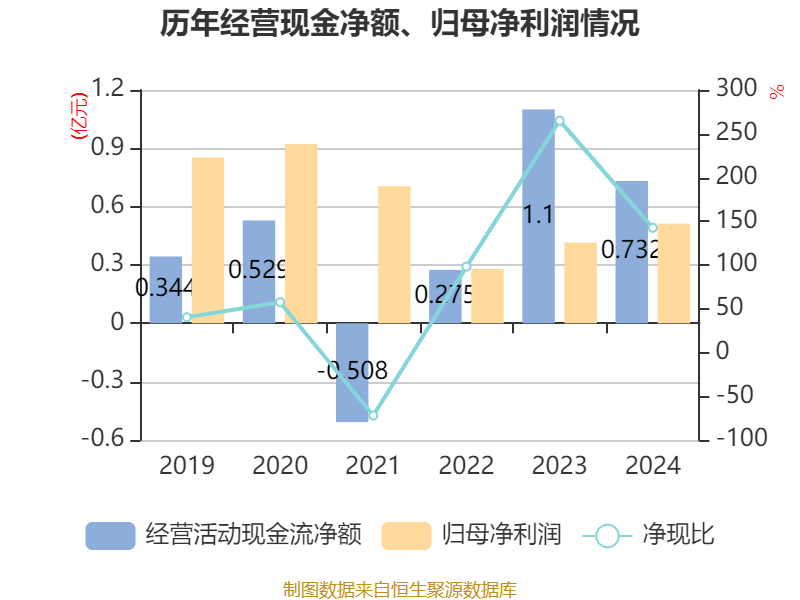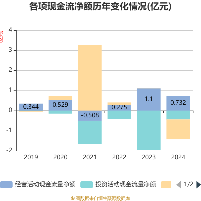 截至2024年,公司经营活动现金流净额为7315.76万元,同比下降33.52%;筹资活动现金流净额-9838.69万元,同比减少9929.19万元;投资活动现金流净额-4419.6万元,上年同期为-1.96亿元。