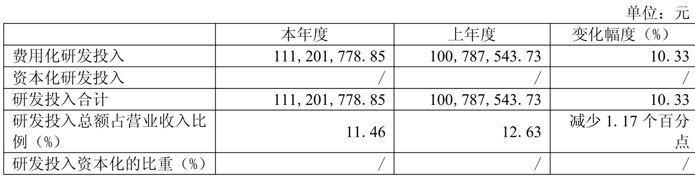 2024年全年,公司研发投入金额为1.11亿元,同比增长10.33%;研发投入占营业收入比例为11.46%,相比上年同期下降1.17个百分点。