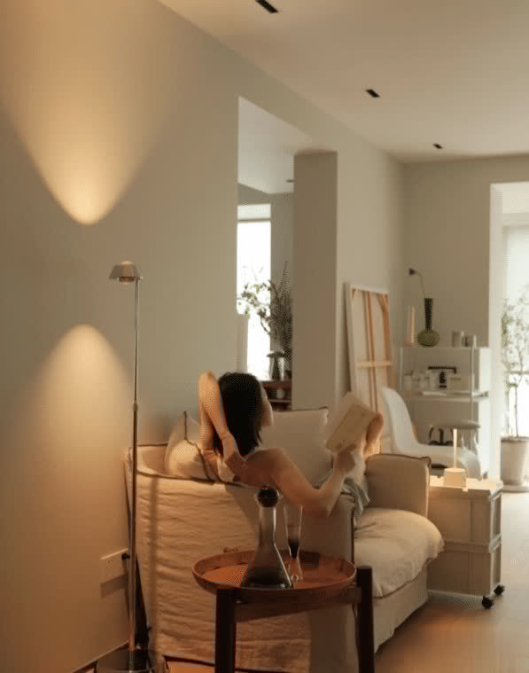 沙发旁边只需要一盏微光,就能感受到被暖光包围的感觉,即使是同样的角度,到了晚上,开启灯光,就好像变了模样,为空间“增色”,整体均匀柔和,局部又能有高光。