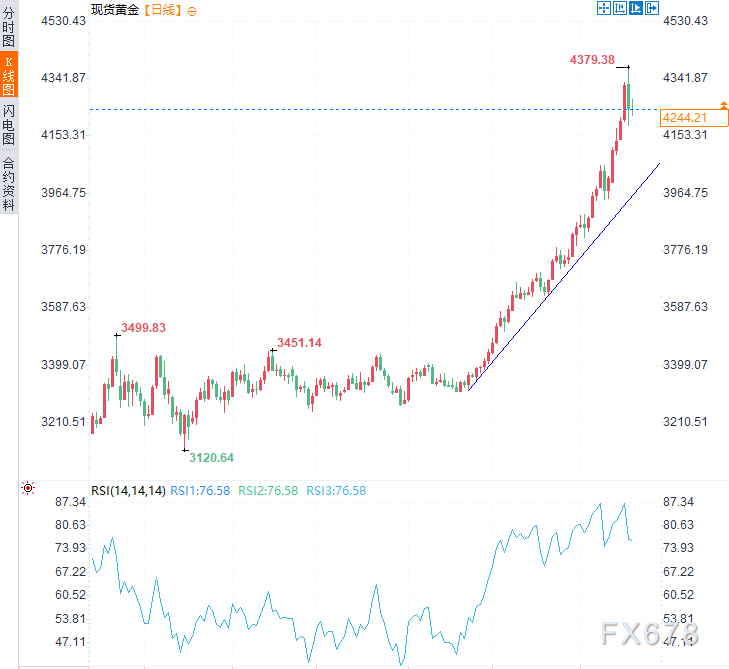 它描绘了一个尽管面临风险,但总体趋于“软着陆”的全球经济前景,这削弱了黄金的短期避险吸引力。然而,声明中强调的几项长期结构性风险,为黄金提供了潜在的中长期支撑。周一因中东地区地缘政治风险助推避险买盘支撑,现货黄金一度冲高至4274.53美元/盎司的高位,而后回落,现交投于4235美元附近,跌幅约0.4%,延续了前一交易日跌势。上周五现货黄金一度创下了4379.38美元/盎司的历史新高,却以1.8%的跌幅收盘于4247.17美元/盎司。