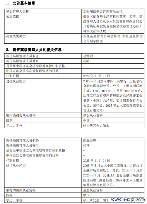 11月22日,工银瑞信发布的高级管理人员变更公告显示,新任杨帆为公司总经理大业证券,新任张桦为副总经理。任职日期2025 年 11 月 21 日。